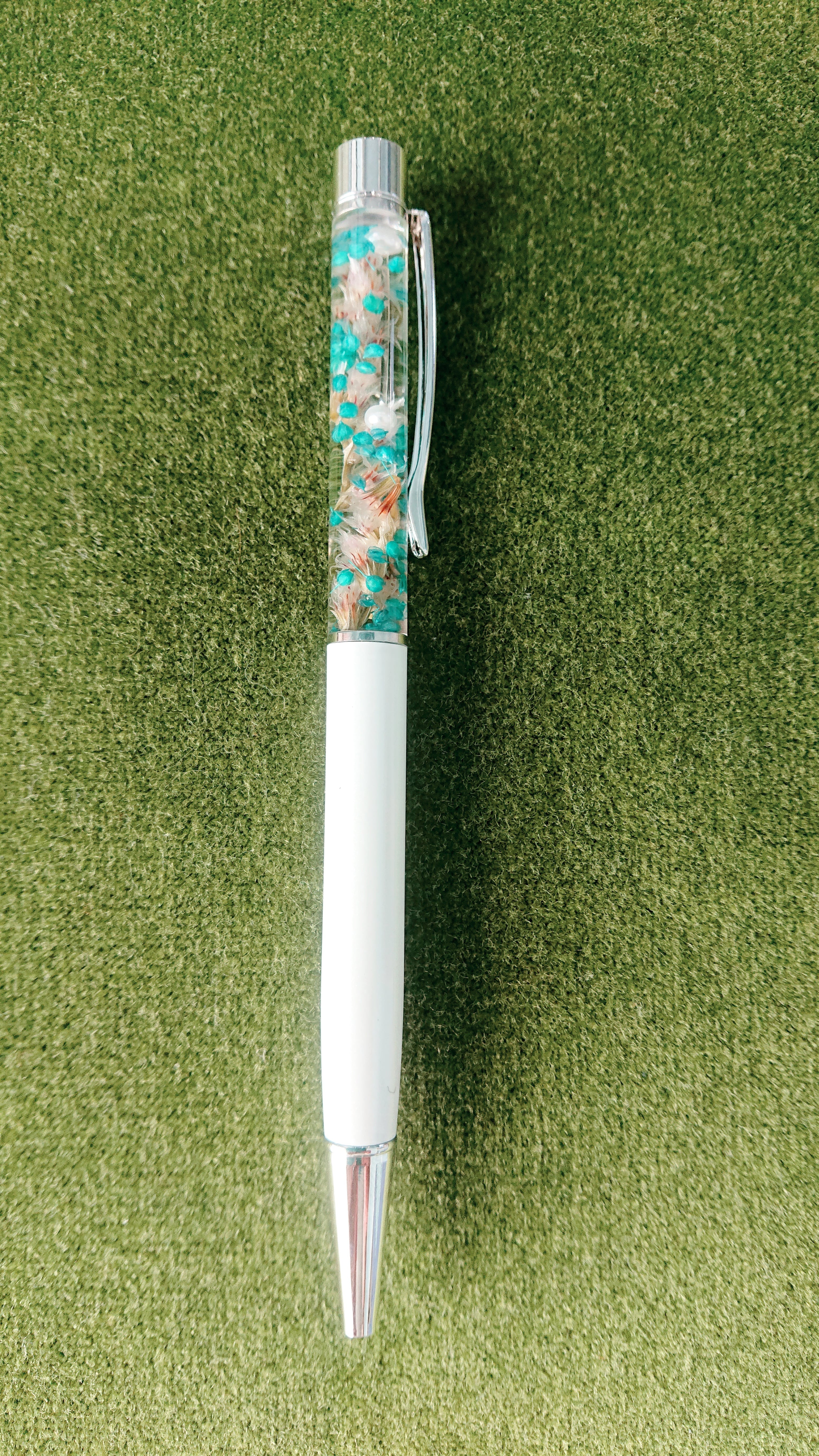 パールと涼しげなブルーのドライフラワー(かすみ草)を贅沢に使用したハーバリウムボールペン。